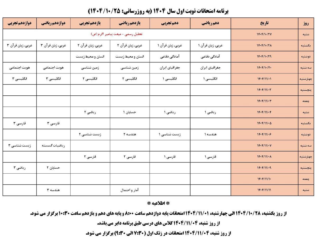 2) از تاریخ 1404/11/4 به بعد ساعت آزمون تغییر یافته و کلیه امتحانات راس ساعت 7/45 شروع و بعد از آن کلاس ها برگزار